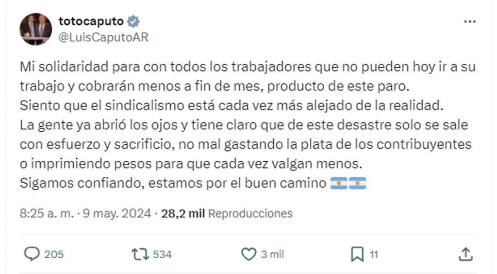 “Mi solidaridad para con todos los trabajadores que no pueden hoy ir a su trabajo y cobrarán menos a fin de mes, producto de este paro”, señaló el ministro a través de su cuenta de “X”.