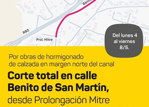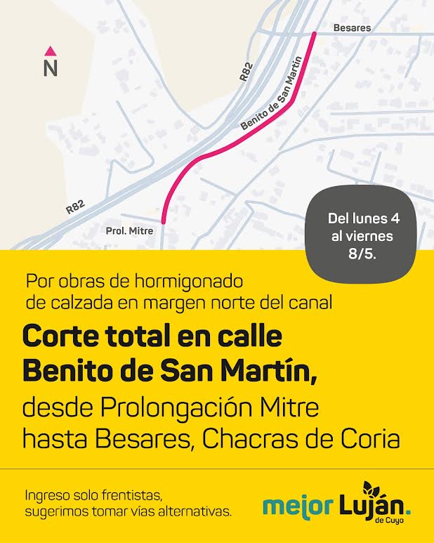La Municipalidad de Luján de Cuyo informa que, a partir del próximo lunes 4 de mayo y hasta el viernes 8 inclusive, se realizará un corte total de tránsito en calle Benito de San Martín, en el tramo que va desde Prolongación Mitre hasta Besares, en el distrito de Chacras de Coria; debido a tareas de hormigonado de la calzada en el margen norte del canal.