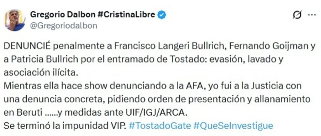 “Denuncié penalmente a Francisco Langeri Bullrich, Fernando Goijman y a Patricia Bullrich por el entramado de Tostado: evasión, lavado y asociación ilícita. Mientras ella hace show denunciando a la AFA, yo fui a la justicia con una denuncia concreta, pidiendo orden de presentación y allanamiento en Beruti y medidas ante la Unidad Información Financiera (UIF), la Inspección General de Justicia (IGJ) y la Agencia de Recaudación y Control Aduanero (ARCA)”, manifestó Dalbón.
