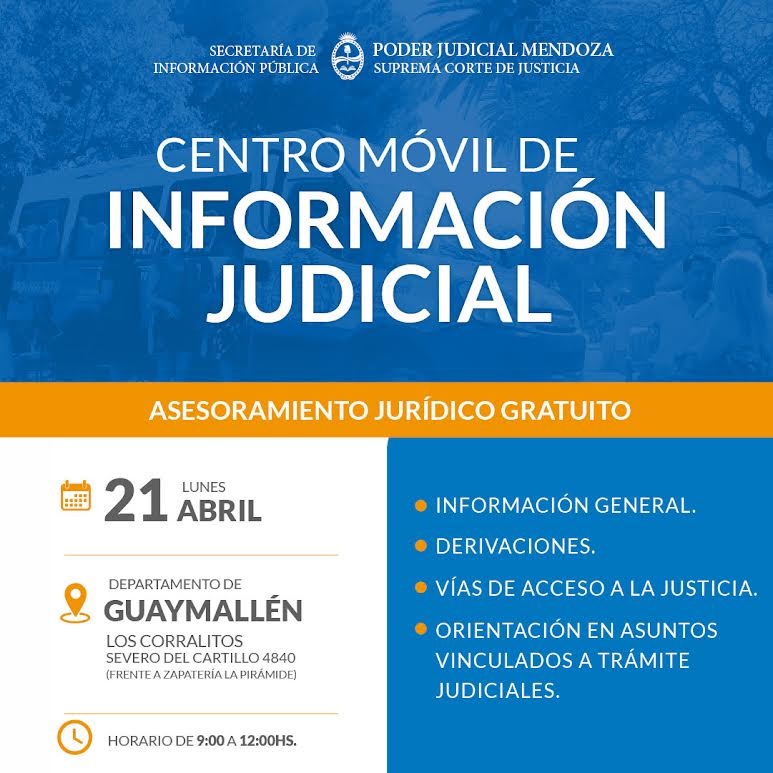 El Centro Móvil de Información Judicial visitará el departamento de Guaymallén, instalándose en Severo del Castillo 4840, Los Corralitos, para ofrecer atención y asesoramiento jurídico gratuito a todas las personas que lo necesiten.