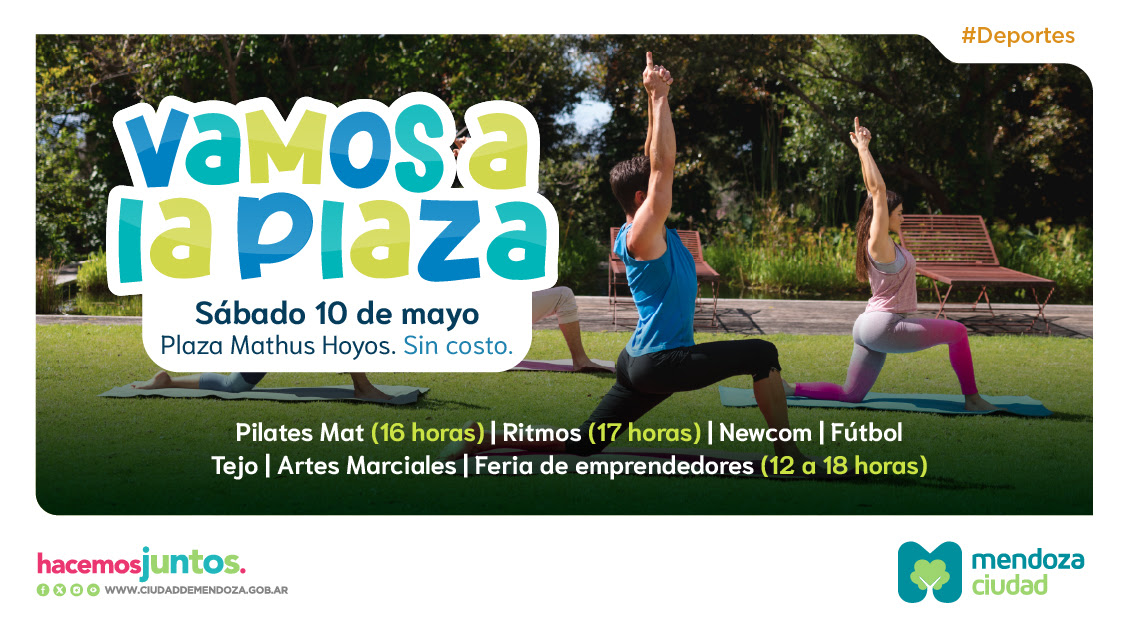 Una vez más, la Ciudad de Mendoza dará curso al programa ¡Vamos a la plaza!. Con él busca promover hábitos saludables y fomentar el deporte. Yoga, bailes, fútbol, tejo, artes marciales, entre las propuestas gratuitas que recorrerán los espacios verdes. La Ciudad de Mendoza invita a vecinas y vecinos a sumarse a una nueva edición de ¡Vamos a la plaza!. Se trata del programa municipal que promueve hábitos saludables y fomenta el deporte. Para ello, propone diversas actividades haciendo un uso recreativo de los espacios públicos verdes.Dentro del cronograma, que comenzará en mayo y se extenderá hasta octubre recorriendo las distintas plazas de la Ciudad, habrá prácticas de yoga, entrenamiento funcional, bailes de distintos ritmos, clases de newcom, artes marciales, fútbol, tejo y hasta ferias de emprendedores.Todas las propuestas, cabe aclarar, son gratuitas, abiertas para todo público y se pueden sumar personas de todas las edades a realizarlas y entretenerse. De esta manera, la Municipalidad de Mendoza continúa trabajando en su consolidación como Ciudad del Deporte. Esto es promover valores a través de la práctica de actividades físicas, deportivas y recreativas; incentivando a la ciudadanía a una participación activa con el fin de minimizar situaciones de riesgo social y vivir una vida más saludable.Así es que, una vez más, se invita a vecinas y vecinos a sumarse y disfrutar de estos pulmones verdes citadinos con una nueva edición de ¡Vamos a la plaza!.A continuación, el cronograma de mayoSábado 10 – Plaza Mathus Hoyos – 12 a 18hsJornada recreativa donde se desarrollará una clase de Pilates Mat a las 16 horas (llevar MAT) y de Ritmos, a las 17. Además, habrá clases de newcom, demostración de artes marciales, fútbol y tejo. Se sumarán a este evento emprendedores y emprendedoras de la zona en una feria abierta a toda la comunidad.Sábado 24 – Plaza Malvinas Argentinas, 6° Sección – 12 a 18hsLa propuesta cuenta con Entrenamiento Funcional, a las 16 horas, y luego Ritmos, a las 17. Además, estará presente el proyecto Conjugando, habrá una clase de Running -junto a runners de Ciudad– a las 16.30 horas y también de newcom. Asimismo, se desarrollará una feria para los emprendedores y emprendedoras.Próximos encuentros