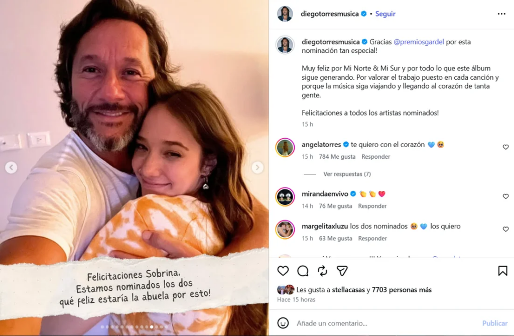 – El cantante Diego Torres compartió un emotivo posteo en sus redes sociales, agradeciendo a los Premios Gardel por su nominación. En una de las imágenes que difundió, resaltó una gran felicitación a su sobrina Ángela Torres, también nominada en la premiación que destaca los mejores proyectos argentinos de este último año.