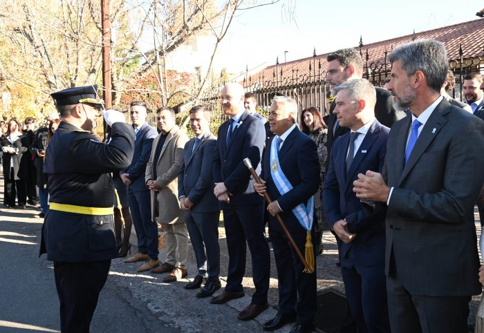 La jornada comenzó con el Toque de Diana de Gloria, ejecutado por la Banda de Música de la Policía de Mendoza, y el saludo formal del Gobernador a la agrupación de Seguridad para, posteriormente, entonar en común el Himno Nacional, evocando el grito de libertad de 1810.