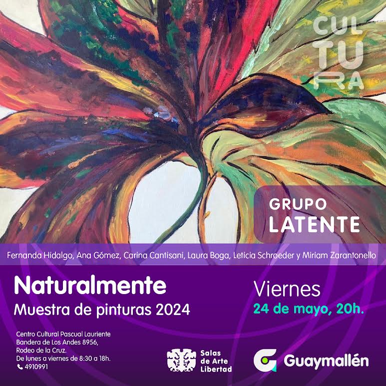 La Municipalidad de Guaymallén invita a la inauguración de la muestra pictórica denominada “Naturalmente”, de las artistas visuales Fernanda Hidalgo, Ana Gómez, Carina Cantisani, Laura Boga, Leticia Schroeder y Miriam Zarantonello, integrantes del grupo Latente. Será el viernes 24 de mayo, a las 20h, en el espacio de arte del Centro Cultural Pascual Lauriente. La exposición estará acompañada por la presentación del libro “Pasos”, de la escritora Eva Zamporlini.