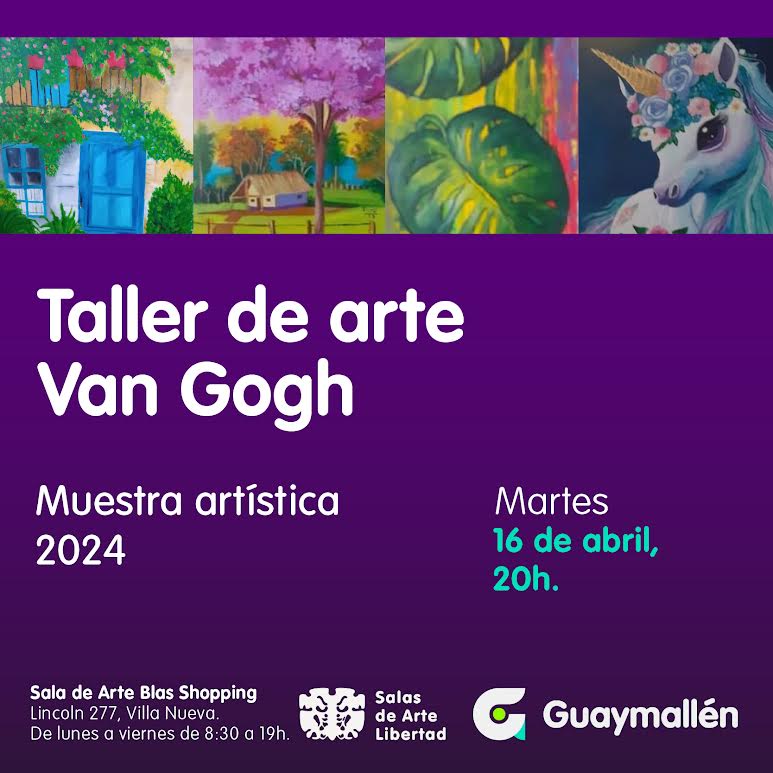 La Municipalidad de Guaymallén invita a participar de la muestra de las alumnas del Taller de Arte Van Gogh, a cargo de la profesora Angélica Guajardo. En esta oportunidad expondrán sus pinturas Victoria y Susana Crayachichi, Camila Lucarelli, Teresa Sosa, Cecilia Saa, Etelvina Lagos, Isabela Versará y Liliana Giordano. La apertura tendrá lugar el martes 16 de abril, a las 20h, en la espacio de arte del Blas Shopping (extensión Salas de Arte Libertad).