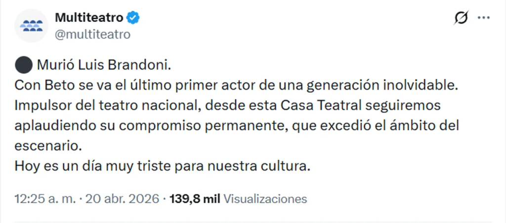 A través de un comunicado que difundió en la cuenta de Multiteatro, despidió a su amigo con dolor y admiración: “Con Beto se va el último primer actor de una generación inolvidable”.