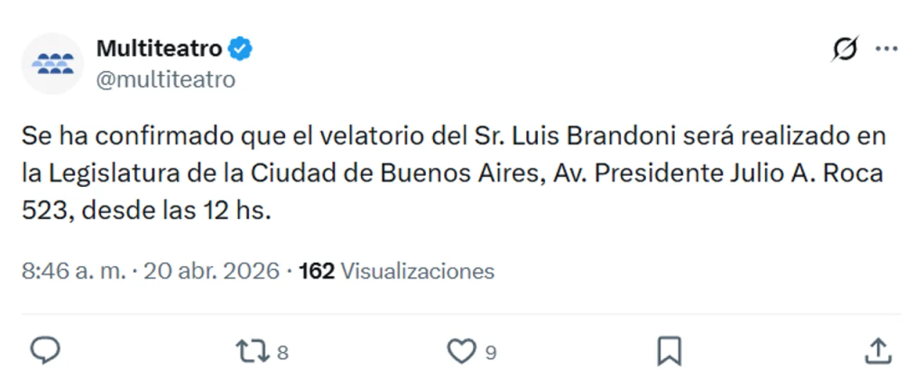 De esta forma, el productor también comunicó que el velatorio se llevará a cabo en la Legislatura porteña desde el mediodía de este lunes hasta la medianoche. __