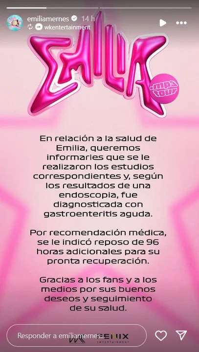 En medio de un hermetismo inicial tras su repentina internación, la producción de la artista reveló detalles de su estado. Emilia fue sometida a una endoscopia que le diagnosticó que padece una gastroenteritis aguda, lo que requerirá un período de reposo para su total recuperación.