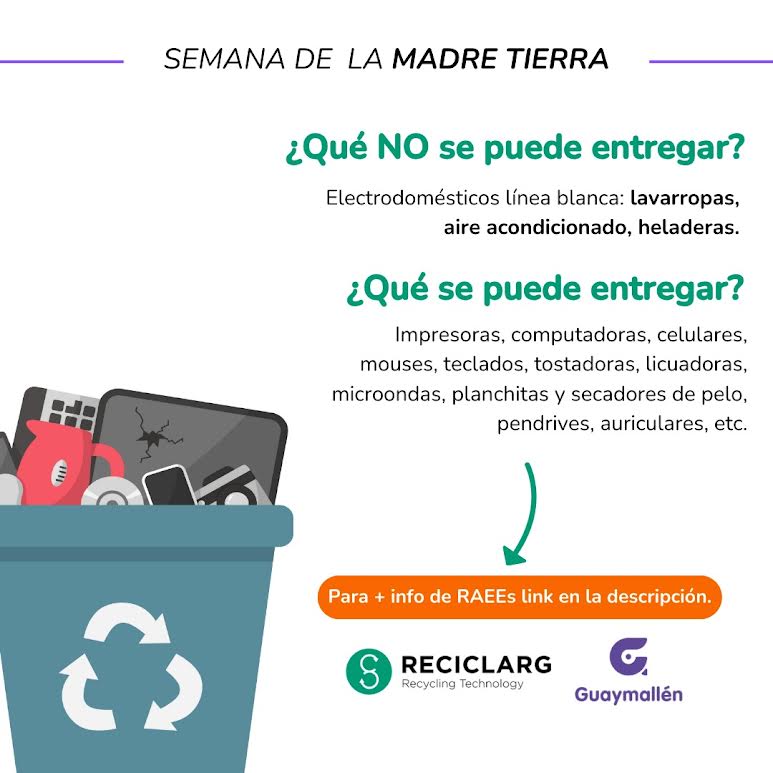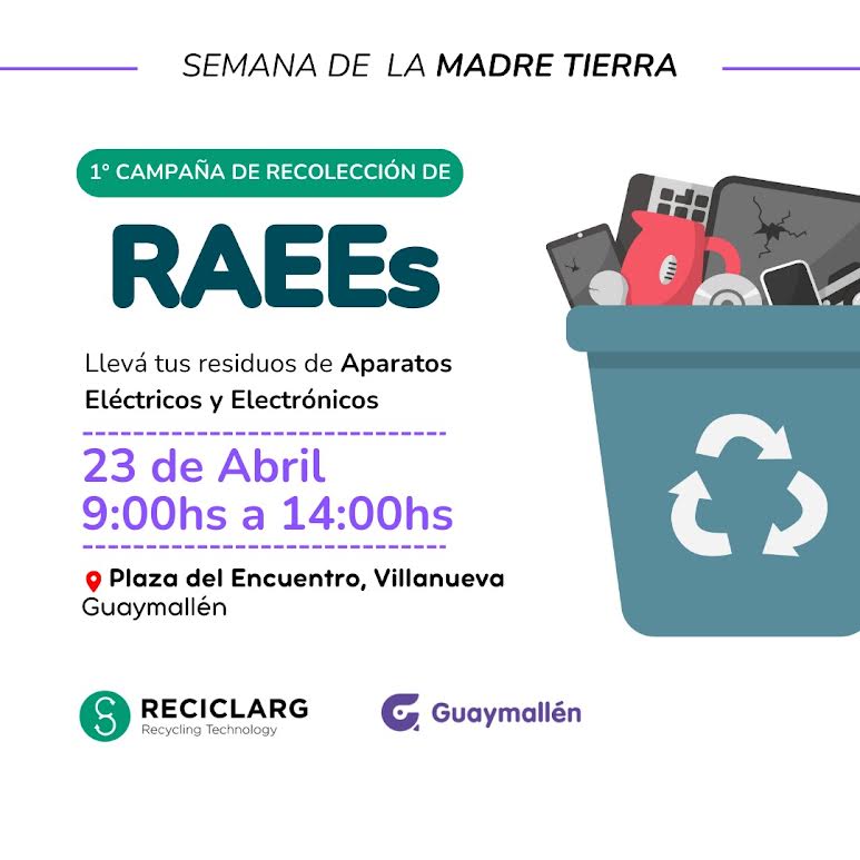 Como parte de las acciones por la Semana de la Tierra, el miércoles 23 de abril, la Municipalidad de Guaymallén en conjunto con la empresa Reciclarg lanza una nueva edición de su Campaña de Recolección de Residuos de Aparatos Eléctricos y Electrónicos (RAEEs). Los vecinos que tengan este tipo de residuos podrán acercarlos de 9 a 14 horas en la Plaza del Encuentro (calle Libertad e Italia, Villa Nueva).