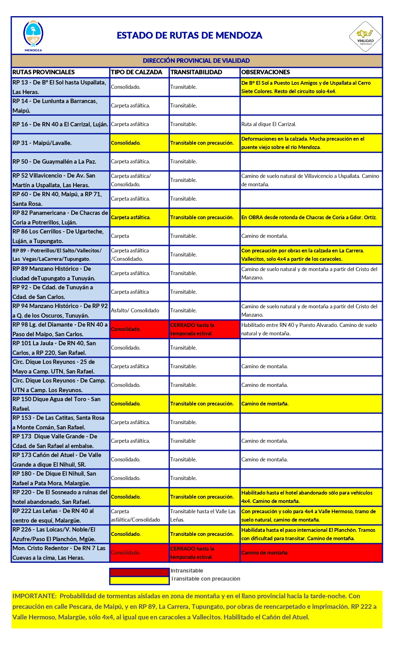 Para conocer el estado de las rutas nacionales en Mendoza, visite el siguiente enlace.