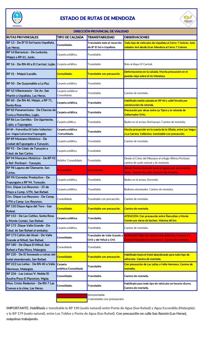 Para conocer el estado de las rutas nacionales en Mendoza visite el siguiente enlace.