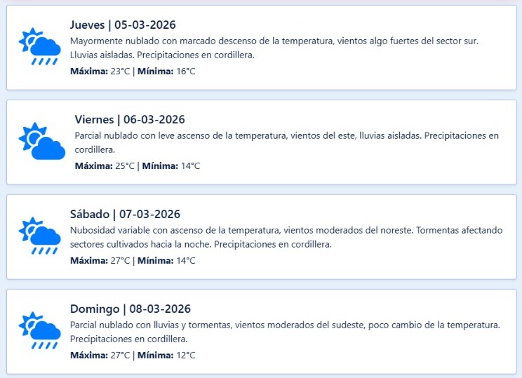 Nubosidad: Cielo mayormente nublado en el Valle de Uco, gran parte del Gran Mendoza y la zona Este (con menor cobertura en el Sur). No se descartan lloviznas o lluvias aisladas hacia la mañana. Mejora progresiva desde las 13. La convección se reactivará desde las 16 en el Oeste del Valle de Uco y del Gran Mendoza, y se extenderá durante la noche hacia la zona Este (departamentos de La Paz y Santa Rosa), con posibles lluvias. En el Noroeste del Gran Mendoza también se esperan precipitaciones. Los modelos no muestran tormentas fuertes ni caída de granizo.