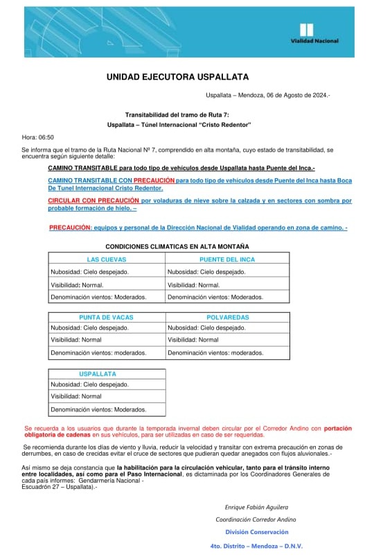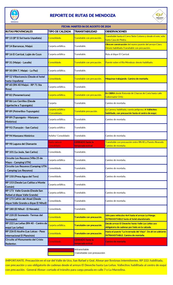 Para conocer el estado de las rutas nacionales en Mendoza, visite el siguiente enlace.