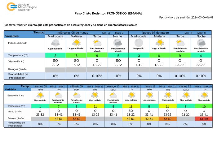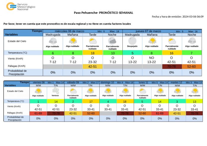 Vientos: Probabilidad de viento oeste con efecto Zonda en Malargüe y Oeste de San Rafael, con velocidades de 45 a 50 km/h. desde las 12:00 hs. aproximadamente hasta las 20:00.
