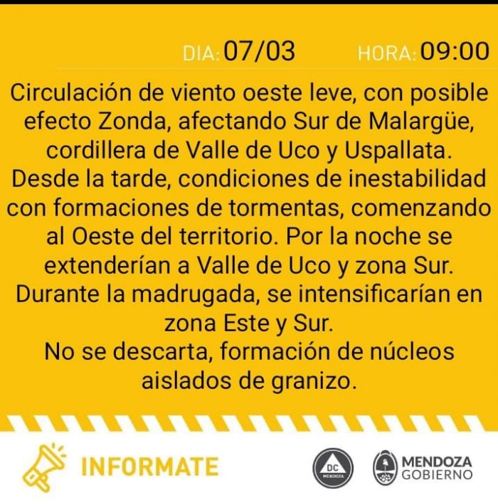 A las 20:00 aproximadamente, se iniciaría la convención en zona Sur de Mendoza. Extendiéndose a toda la Provincia, hasta las 06:00 hs. del día Sábado. Precipitaciones intensas de lluvia y no se descartar la probabilidad de formación de núcleos aislados con granizo.