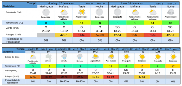 Nubosidad: Nublado desde aproximadamente las 6, con probabilidades de precipitaciones débiles en zona Este y en toda la franja Este provincial. Luego, despejado durante la tarde. Aumento de nubosidad hacia la noche en la zona Este, con probabilidades de precipitaciones durante la noche y la madrugada del martes.