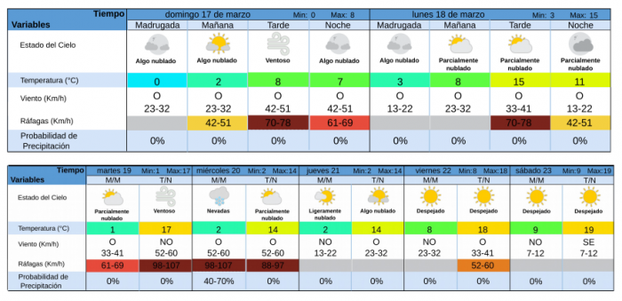 Alta montaña: Poca nubosidad, con precipitaciones débiles en precordillera. Se espera una máxima de 18°C.