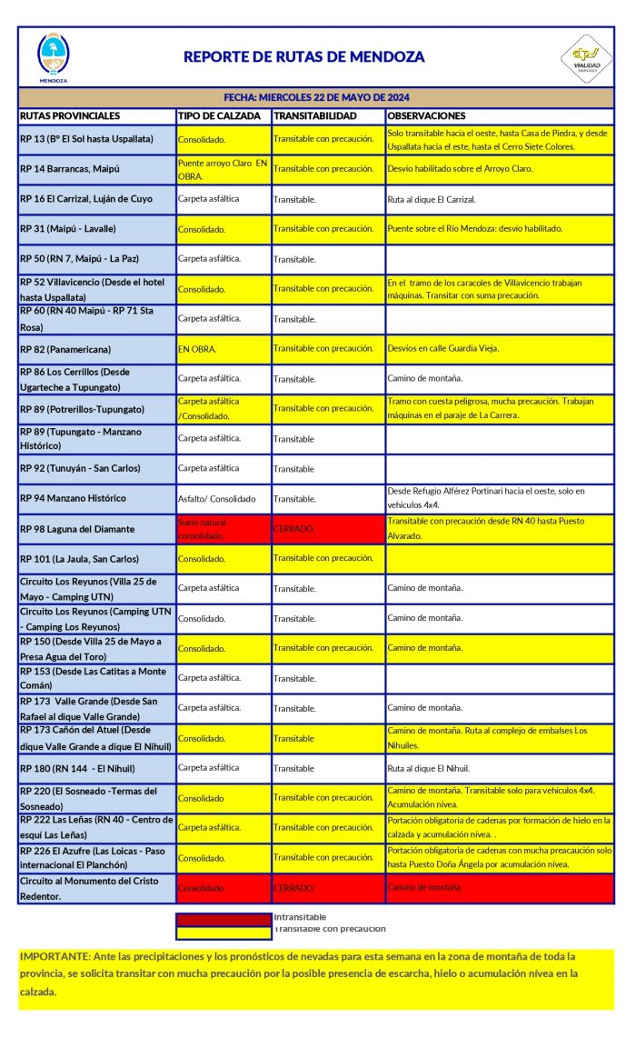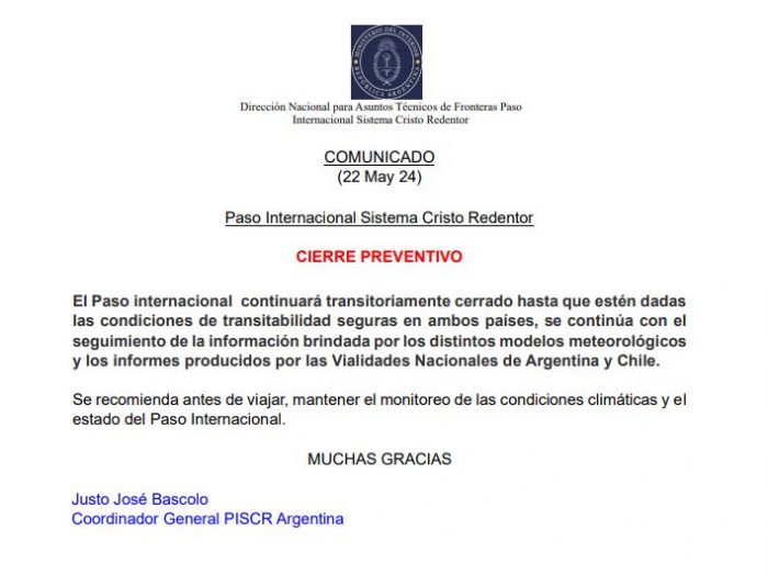 Sistema Integrado Cristo Redentor: Cerrado por nevadas. Inestable hasta el jueves 24 inclusive.