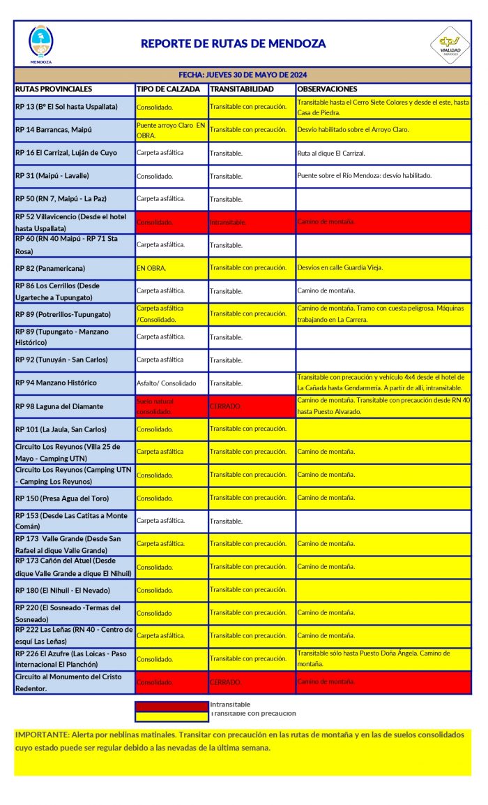 Estado de las rutas y del tiempo en Mendoza