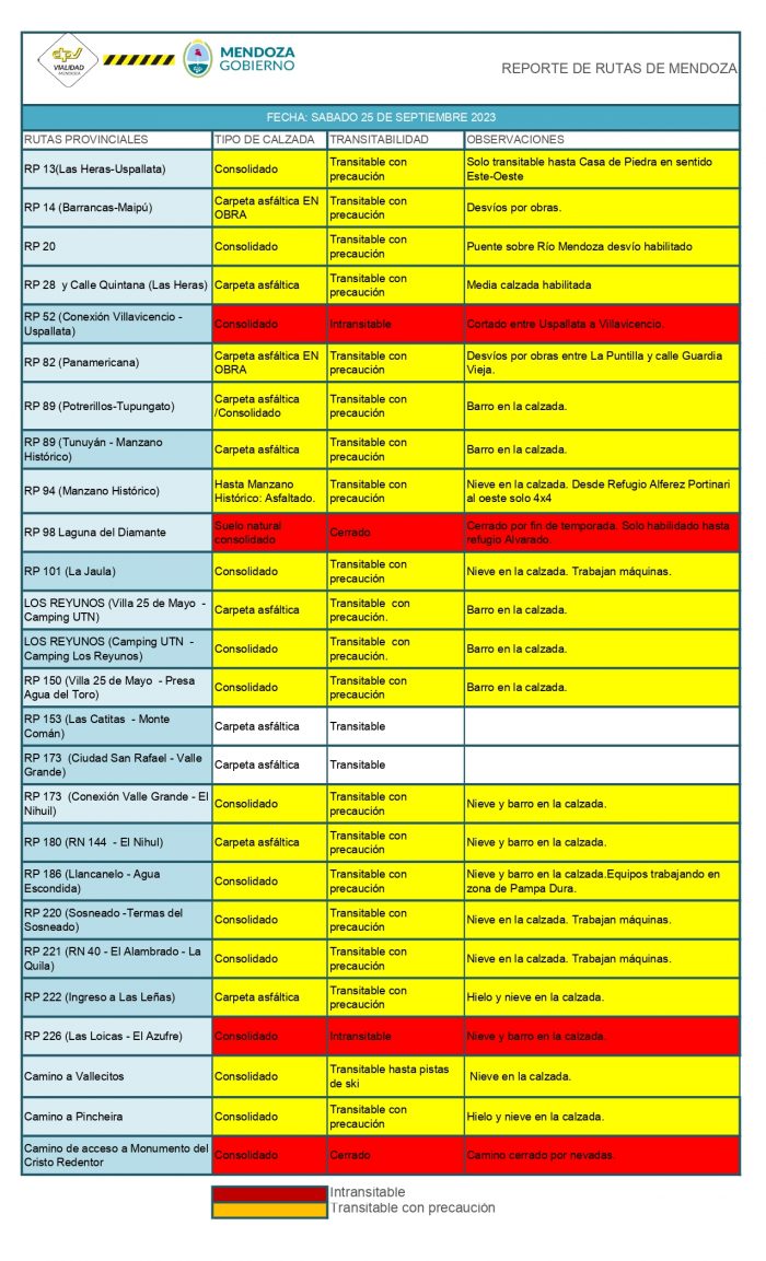 Se recomienda, en días de viento y lluvia, reducir la velocidad y transitar con extrema precaución en zonas de derrumbes. En caso de crecidas, evitar cruzar sectores que pudieran quedar anegados con flujos aluvionales.
