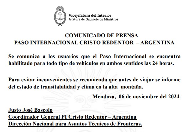 Sistema Integrado Cristo Redentor: Habilitado las 24 horas para transporte de cargas, ómnibus y particulares.