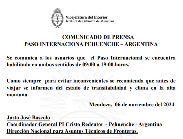 Paso Pehuenche: Habilitado de 9 a 19 para todo tipo de vehículos.