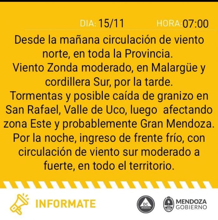 Tormentas: Inicialmente, cielo despejado en el llano. Alas 16 comenzarían a formarse núcleos de tormenta en la zona Sur. Luego se extenderían al Valle de Uco, como también a la zonas Este y Sur del Gran Mendoza. No se descarta posible caída de granizo. La situación de inestabilidad y tormentas se prolongaría hasta la madrugada del sábado.