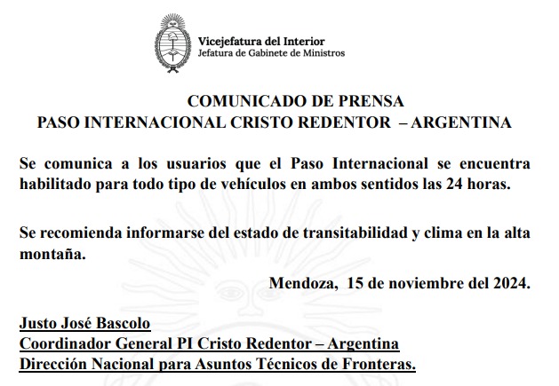 Sistema Integrado Cristo Redentor: Habilitado las 24 horas para todo tipo de vehículos.