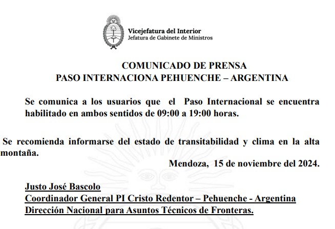 Paso Pehuenche: Habilitado de 9 a 19 para todo tipo de vehículos.