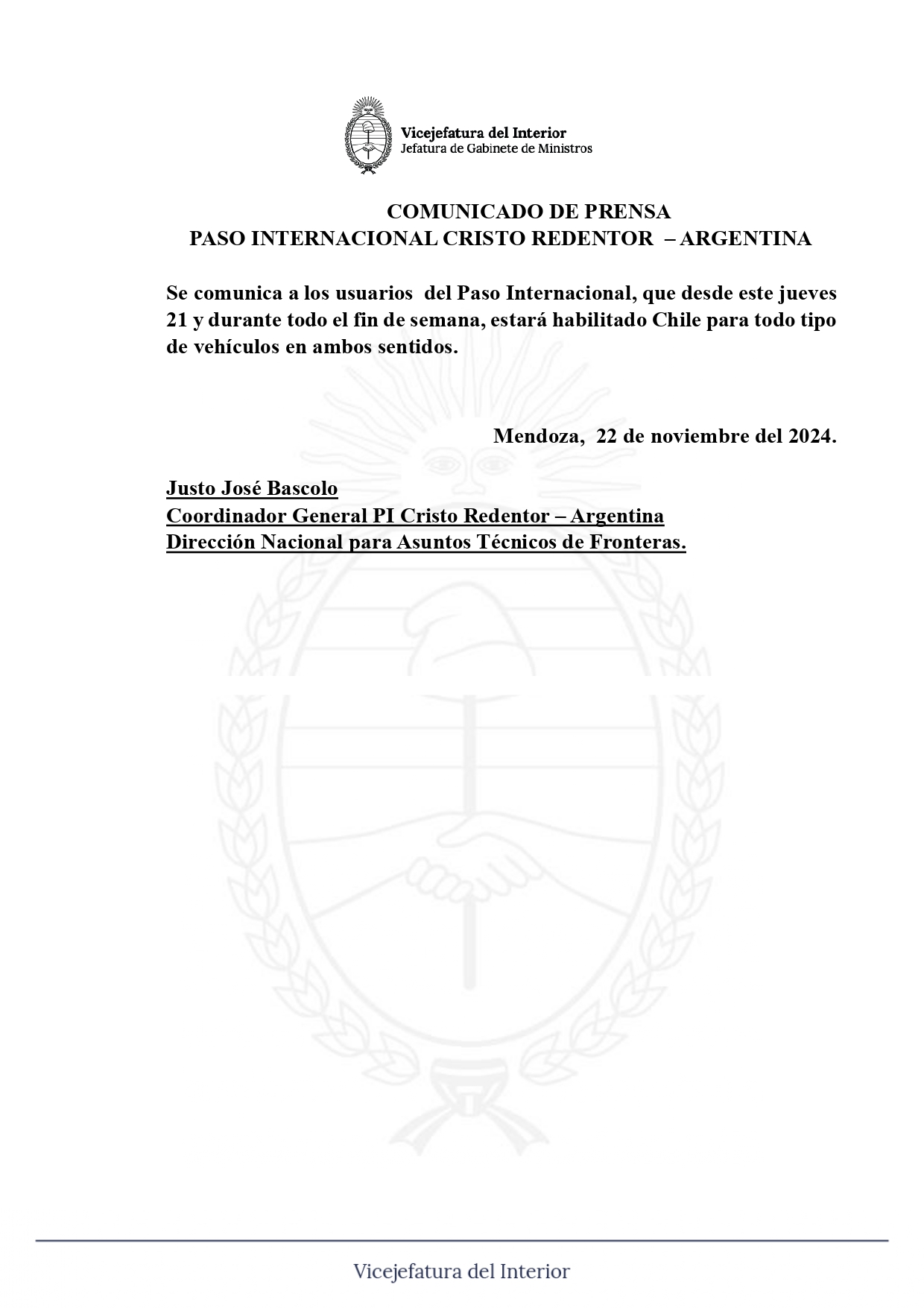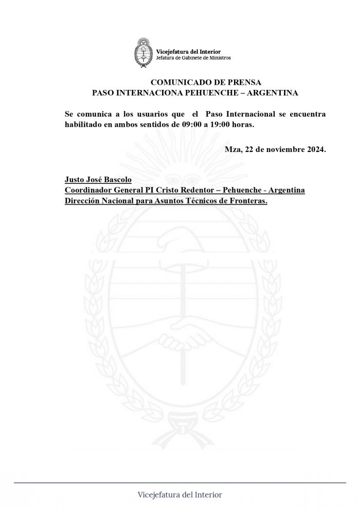 Conforme a lo comunicado por la coordinación argentina del Paso Internacional Sistema Cristo Redentor, se interrumpirá para todo tipo de vehículos el 20, 21, 25, 26, 27 y 28 de noviembre y 2, 3, 4, 5, 9 y 10 de diciembre, seis horas de cada jornada. La empresa Opeka, por razón particular, realizará trabajos de reparación de los portones de ingreso a la obra de arte (RN 7, km 1.236 túnel internacional).