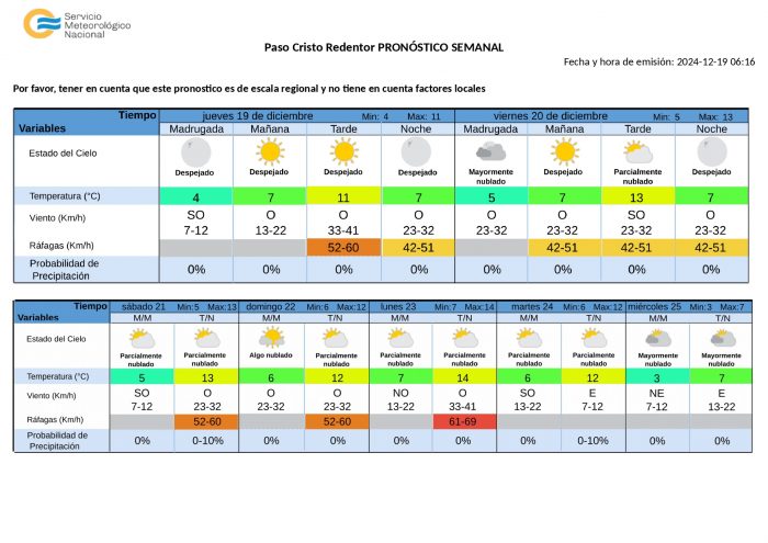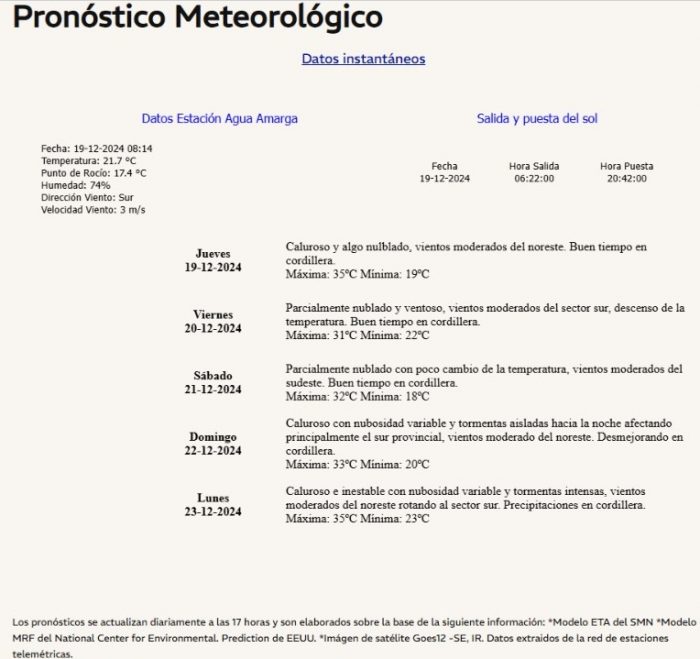 Nubosidad: Amanecer seminublado en zona Sur. A partir de las 21, inestabilidad en zona de Malargüe y Sur de Malargüe, con probabilidad de tormentas débiles.