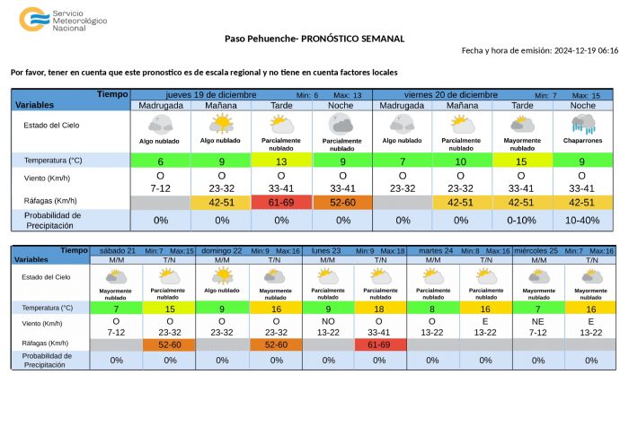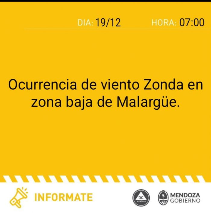 Viento: Circulación de norte a sur en forma leve desde las 12 hasta las 21 en toda la provincia. Se inicia en las zonas Norte y Este. Viento Zonda en forma leve desde las 14 hasta las 20 en Malargüe, Sur de Malargüe y precordillera Sur.