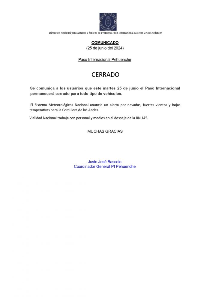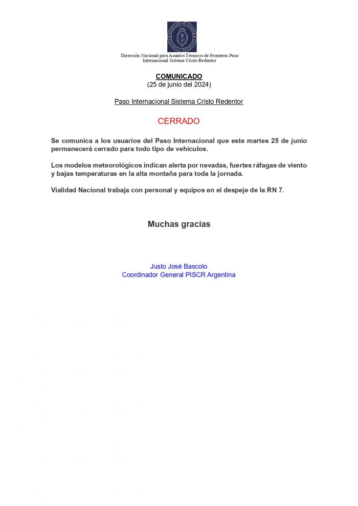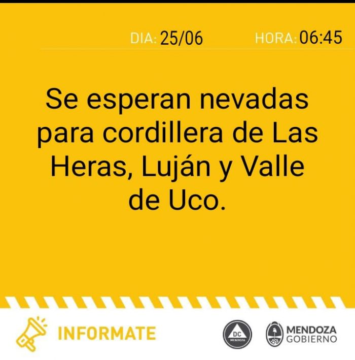 -Ruta 7, momentáneamente, corte preventivo tramo Mendoza-Uspallata por nevadas débiles durante la madrugada. - LUJÁN: Temperatura de 1°C., cielo nublado sin viento y sin precipitaciones.