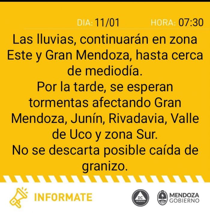 Nubosidad: Amanece con cielo cubierto y precipitaciones de lluvia moderadas a intensas, afectando gran parte de la zona Este y más débil en Tunuyán, Luján de Cuyo y Ciudad de Mendoza. Breve descenso en las precipitaciones hasta el mediodía. A partir de las 14 reactivación de tormentas iniciando en el Oeste del Gran Mendoza y Oeste del Valle de Uco, extendiéndose hacia todo el Gran Mendoza, Norte del Valle de Uco, Oeste de San Rafael, cordillera Sur y Malargüe. Mayor intensidad prevista en Gran Mendoza, Luján de Cuyo y zona del Carrizal hasta las 23.