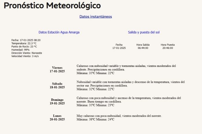Viento: Viento Zonda muy leve en el Sur de Malargüe entre las 15 y 19. Ingreso de viento sur moderado desde las 20 en zona Sur, se extiende a zonas Norte y Este entre las 21 y las 22. Los modelos indican velocidades promedio de 40 km/h hasta la madrugada del sábado.