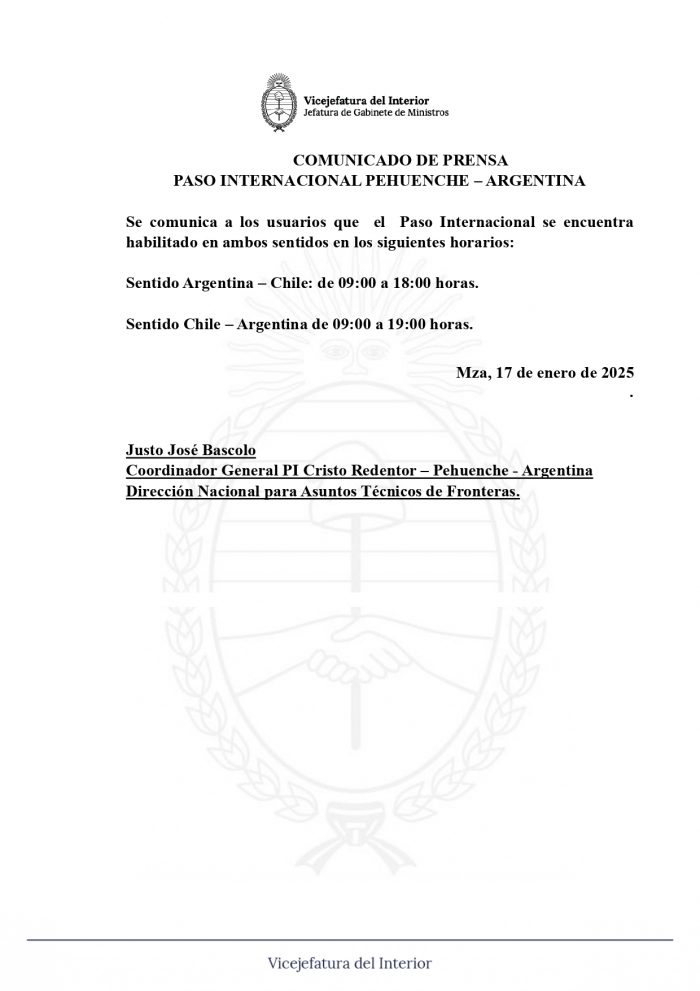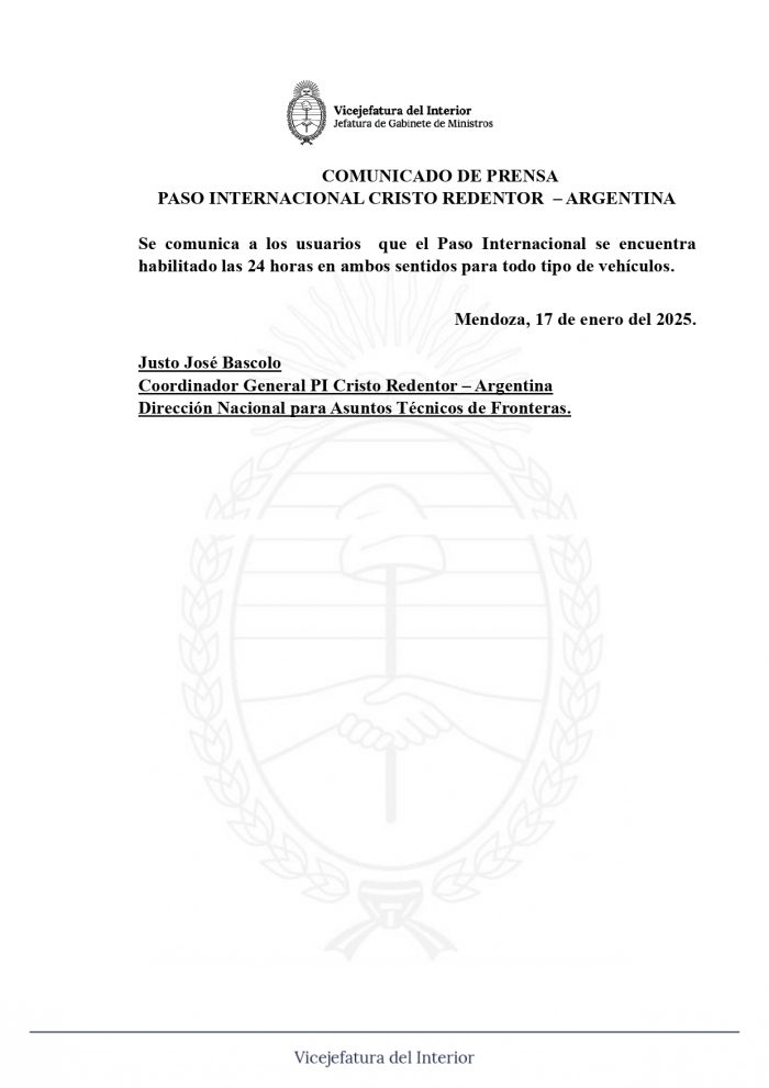 Sistema Integrado Cristo Redentor: Habilitado las 24 horas para transporte de cargas, ómnibus y particulares.