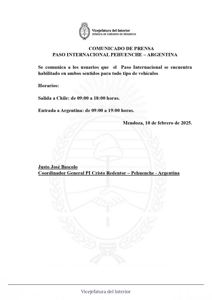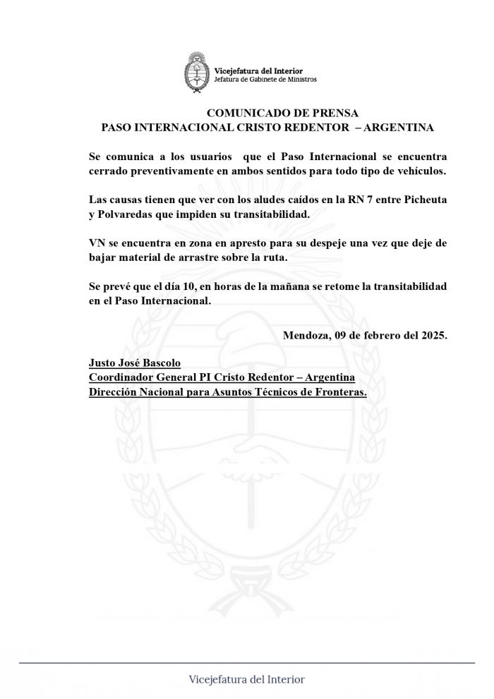 El tránsito desde Uspallata a la alta montaña continuará restringido hasta que se entregue la transitabilidad definitiva, oportunidad en que se coordinará la habilitación del Paso Internacional.
