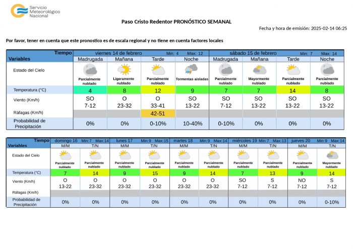 Nubosidad: Amanece inestable, con posibles precipitaciones débiles, especialmente en zona Este y Gran Mendoza. Esta condición se mantendría durante la mañana hasta las 14. Posteriormente se espera una mejora progresiva, y se despejaría casi totalmente en toda la provincia.