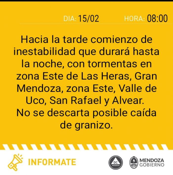 Nubosidad: Seminublado e inestable en Valle de Uco y San Rafael hasta las 11 o 12. Inicio de convección a las 16, comenzando por el oeste del Valle de Uco y oeste del Gran Mendoza. Durante la tarde noche, se extendería a todo el Valle de Uco y San Rafael. Hacia la madrugada, la inestabilidad alcanzaría zona Este. No se descarta posible caída de granizo.