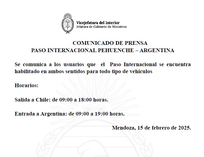 Paso Pehuenche: Habilitado de 9 a 19 para todo tipo de vehículos.