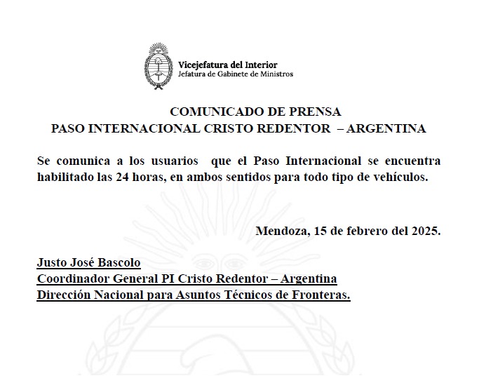Sistema Integrado Cristo Redentor: Habilitado para transporte de cargas, ómnibus y particulares.