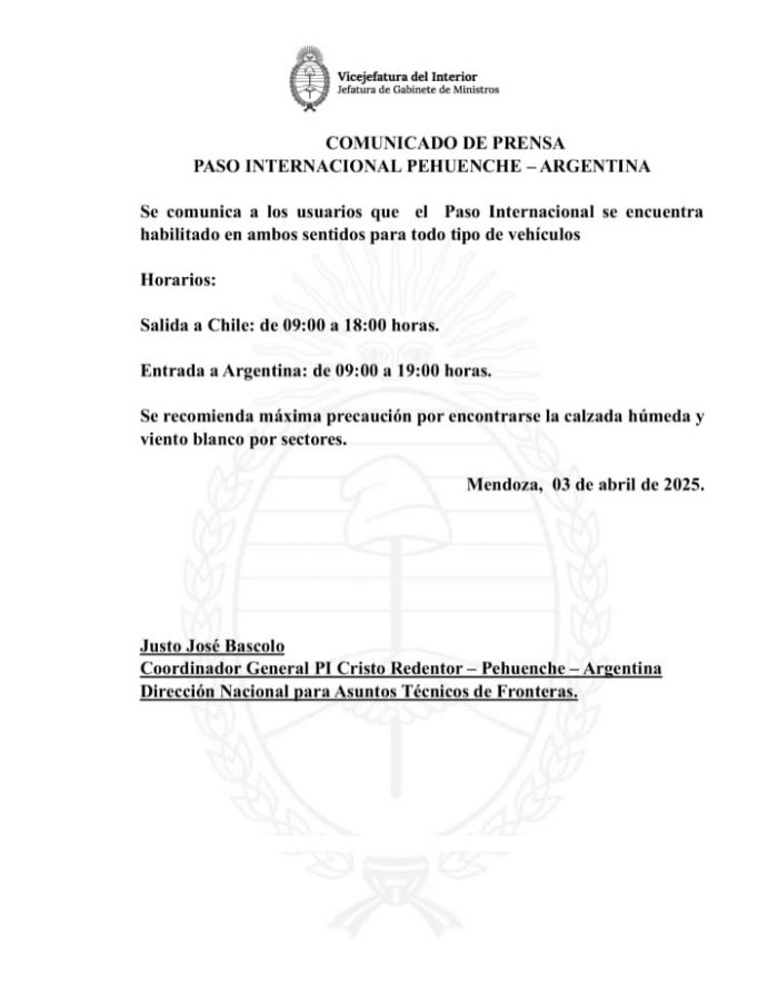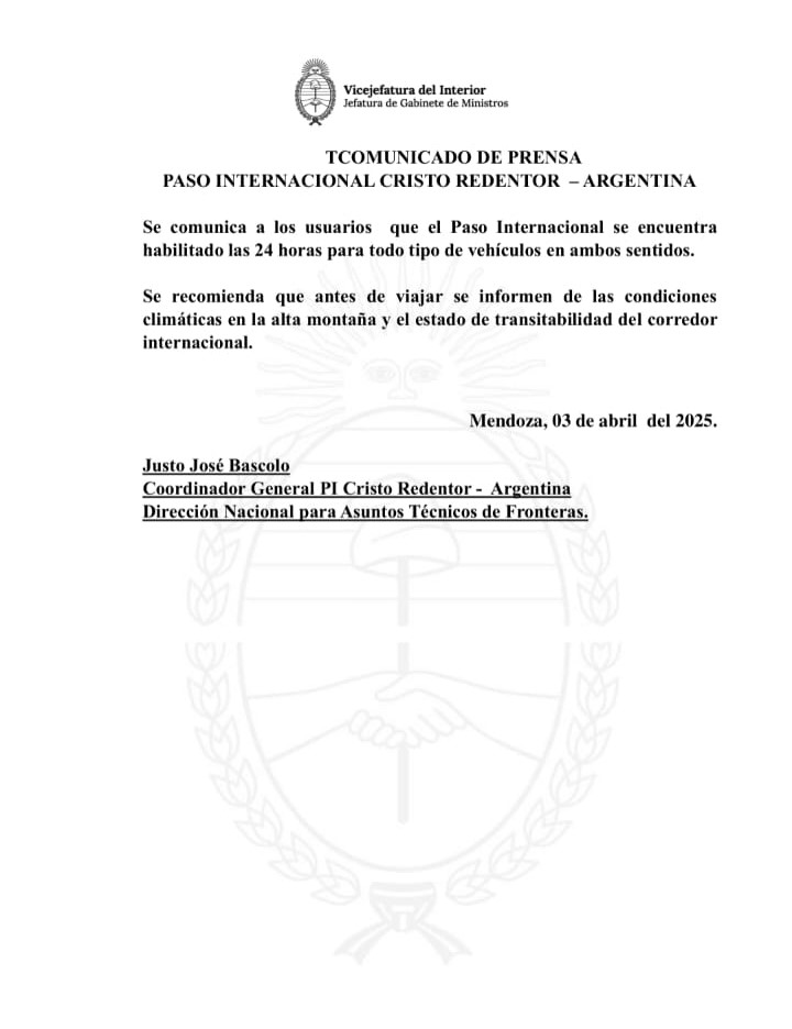 Habilitado las 24 horas para transporte de cargas, ómnibus y particulares.