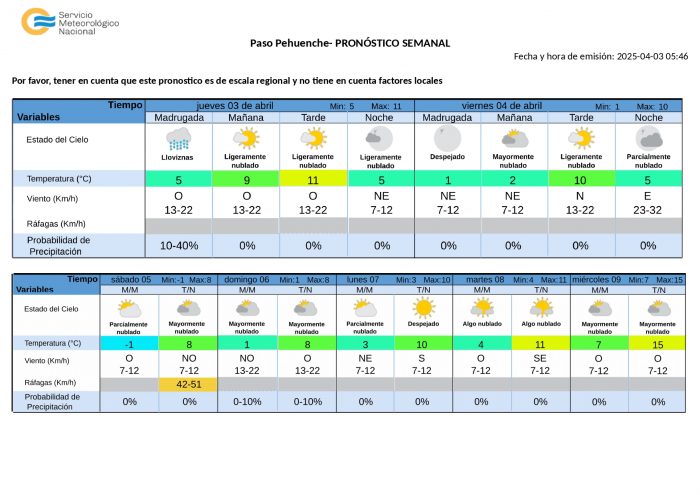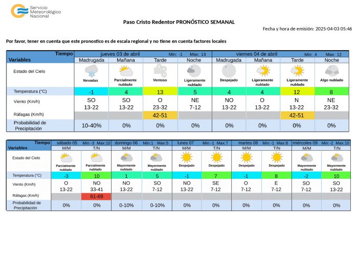 Alta Montaña: Alterna entre cielo despejado y seminublado en toda la cordillera provincial.