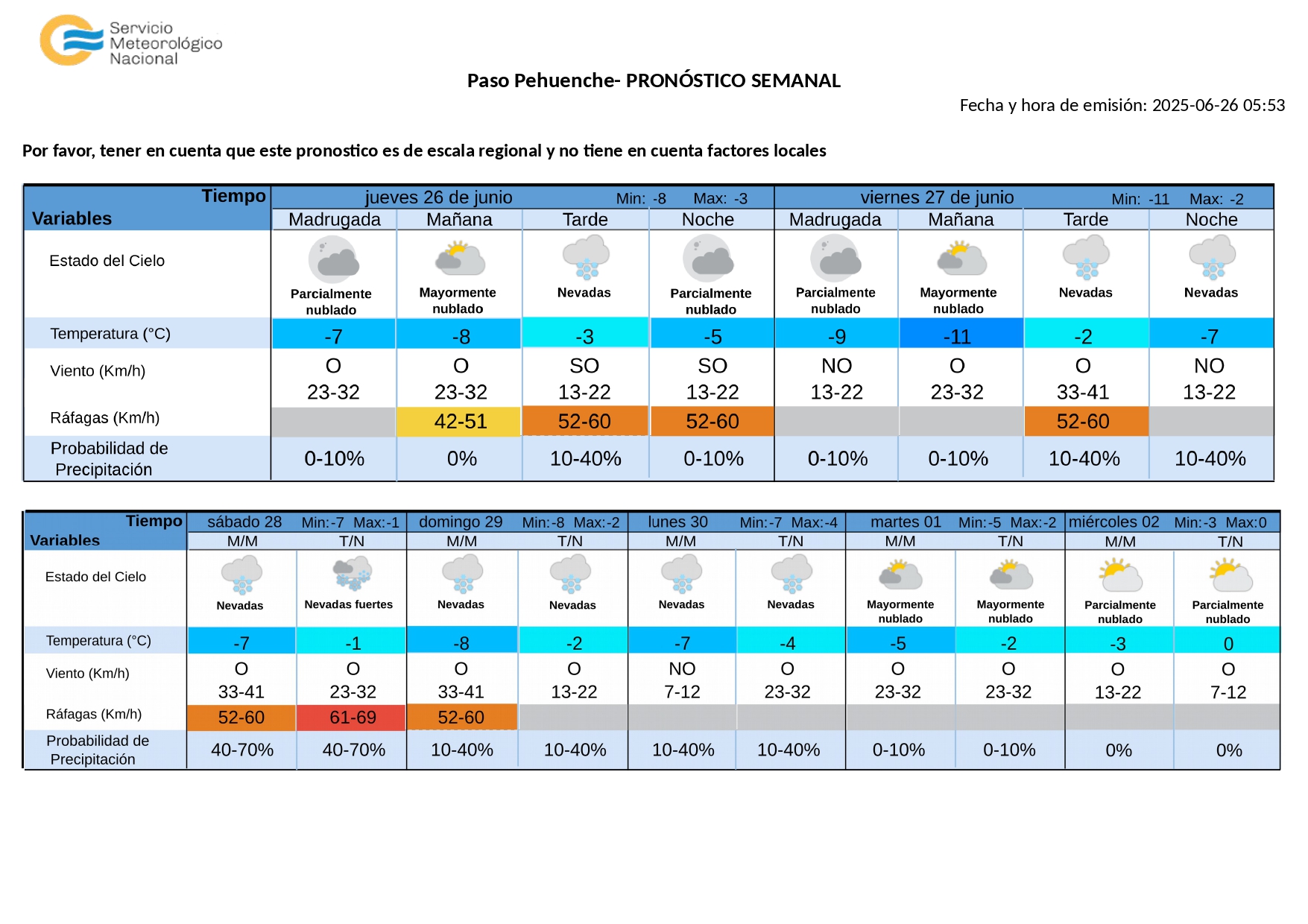 - Mínimas: -6°C en zona Sur, -2°C en zona Este.