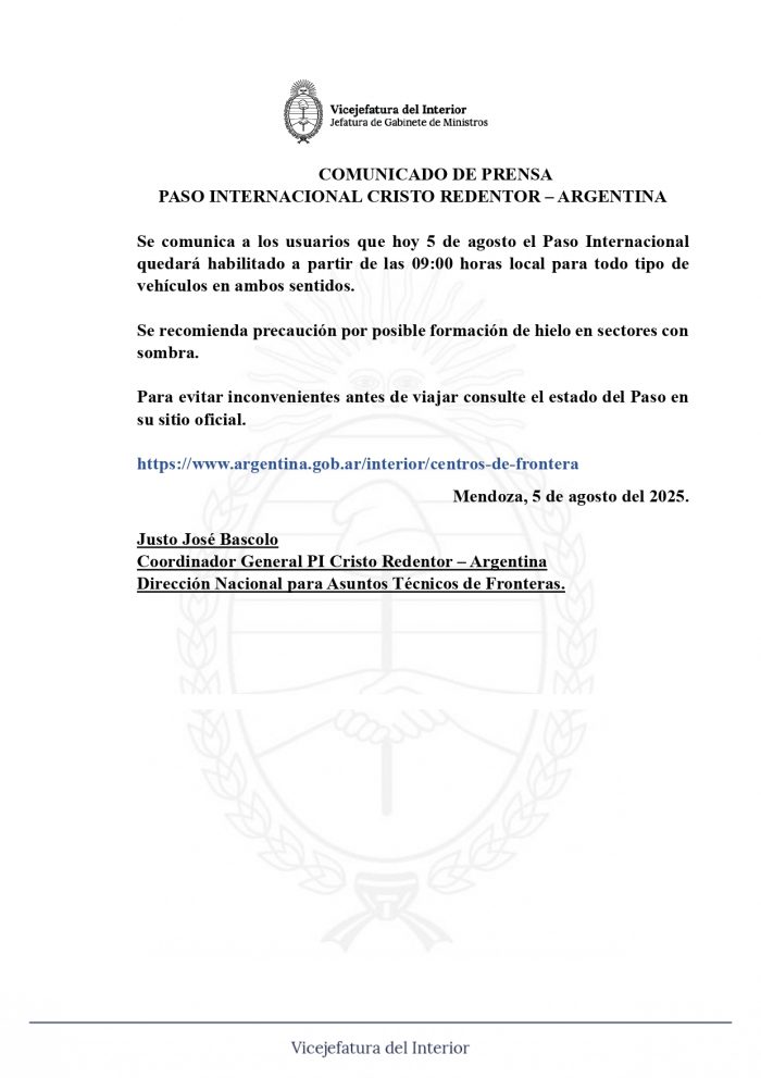 Paso Internacional Cristo Redentor: Habilitado de 9 a 21 para todo tipo de vehículos.