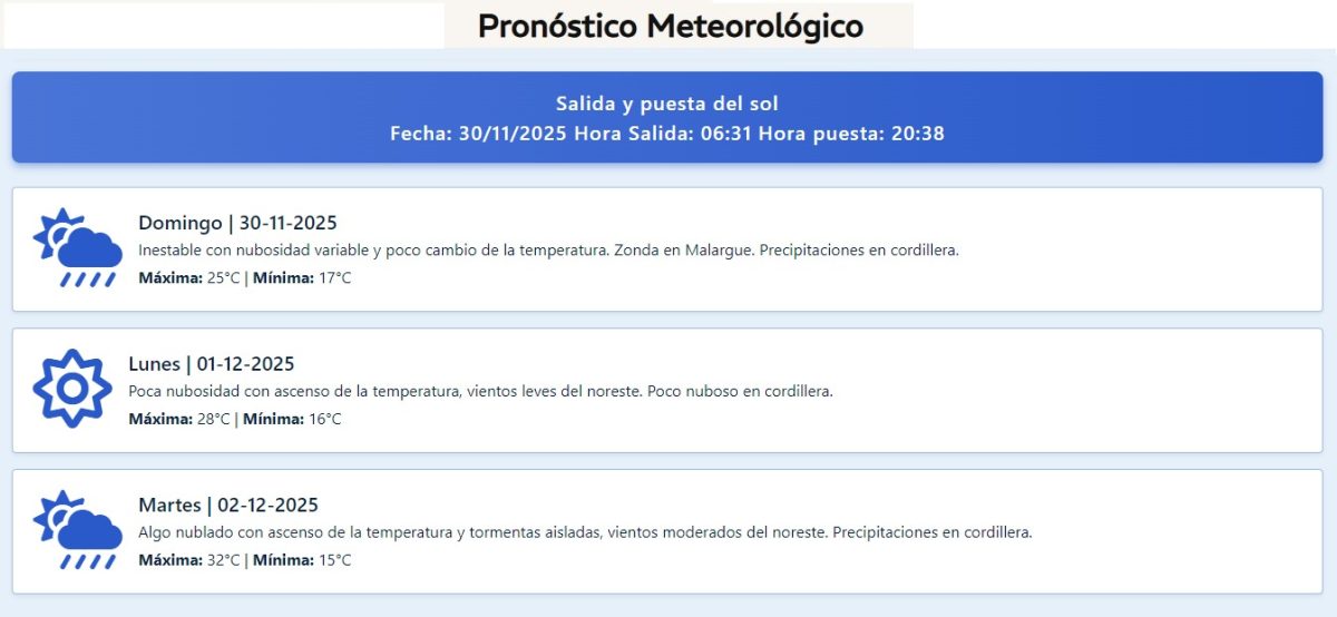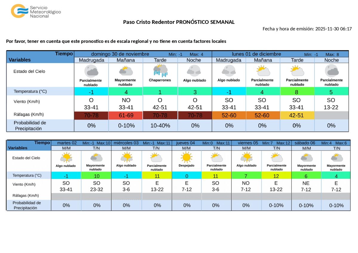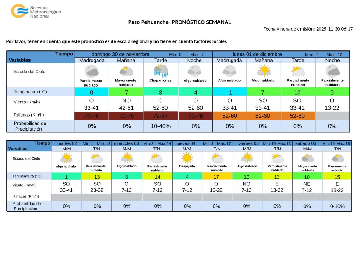 Presencia de viento Zonda a partir de las 11 hasta las 21, afectando principalmente cordillera Sur, Malargüe, Sur de Malargüe y sectores del Valle de Uspallata con menor intensidad. En Malargüe y el Sur del Valle de Uco, los modelos anticipan ráfagas promedio de 45 km/h desde las 16 en adelante.