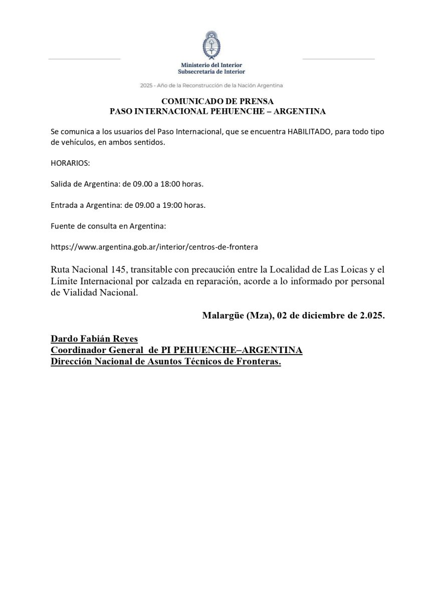 Paso Pehuenche: Habilitado de 9 a 18