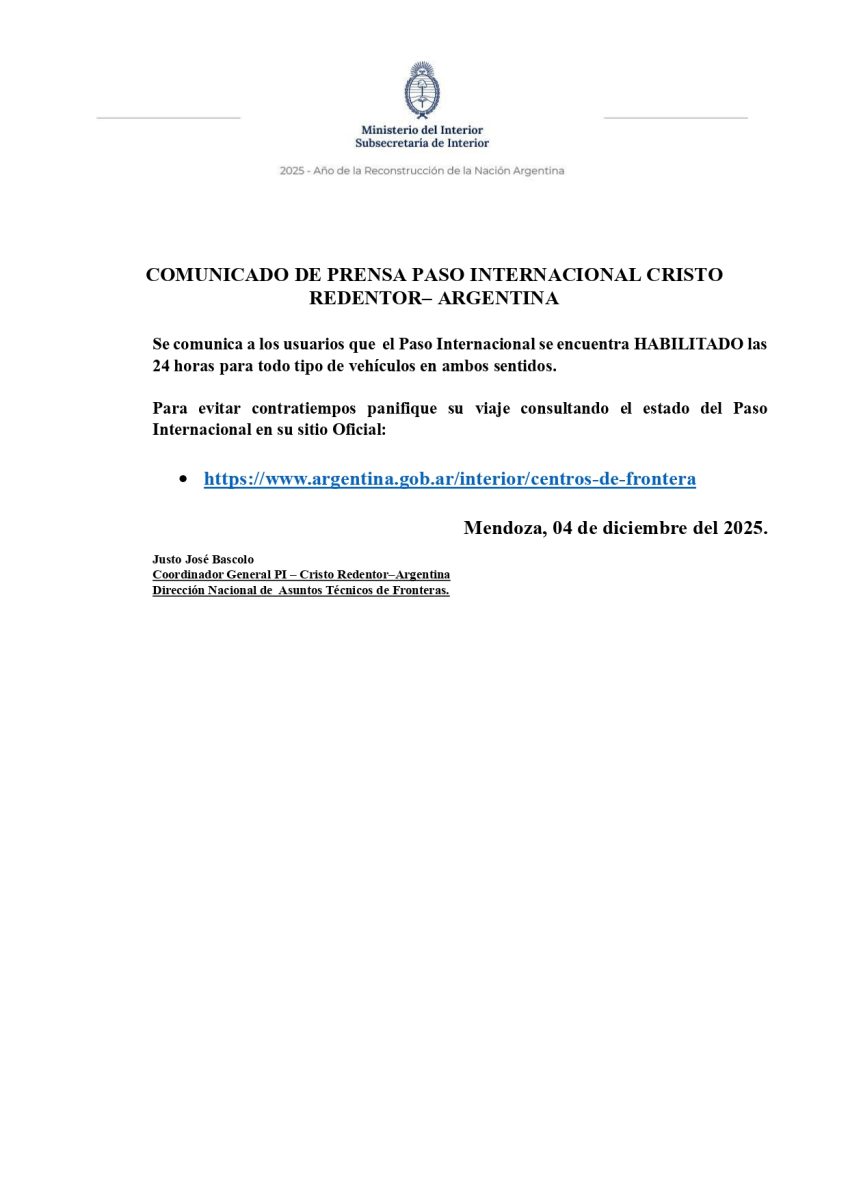 Sistema Integrado Cristo Redentor: Habilitado las 24 horas para todo tipo de vehículos.
