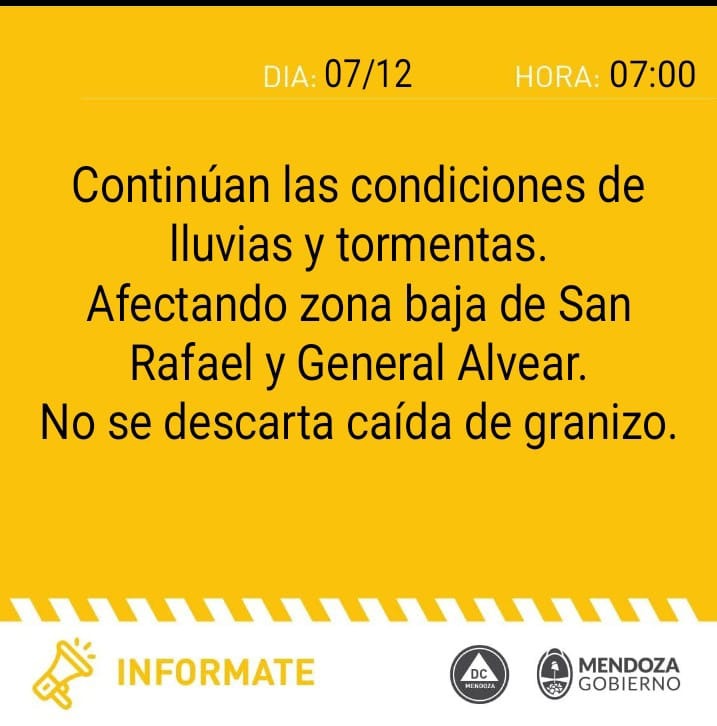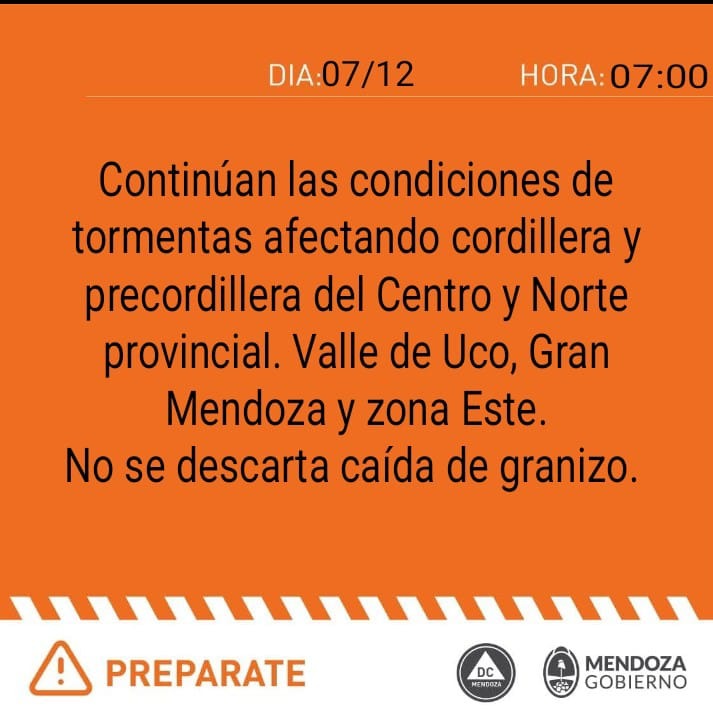 Desde las 19 o 20 se prevén precipitaciones más importantes en el Gran Mendoza y, hacia las 21, en el Norte provincial. Posteriormente, las tormentas avanzan hacia el Valle de Uco y la Zona Este. Existe probabilidad de caída de granizo de tamaño reducido en el Valle de Uco, el Gran Mendoza y la Zona Este. Las precipitaciones continuarán durante la madrugada del domingo.
