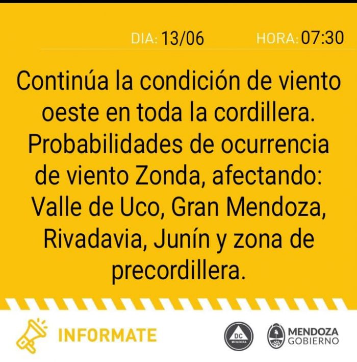 Viento: Durante la mañana, circulación de viento Zonda en zona de precordillera, oeste de Gran Mendoza, Valle de Uco, San Rafael y oeste de General Alvear, con velocidades promedio entre 20 y 25 km/h.